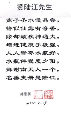 新疆63歲的賀兆生飲用一年,冠心病未愈,他用電話介紹是食堂管理員,問他食量多少?說吃七八分飽,睡前還吃兩袋牛奶,陸 江說我在論文和書中多次批判“吃七八分飽”,關照患者務必用“己饑方食”控制主食肉食量,要他把牛奶改在早中餐吃,減少主食肉食量,建議不吃晩餐,晚上只吃一個蘋果,再經(jīng)幾個月補水節(jié)食,治愈了21年的冠心病和肥胖、失眠等病,信中由衷地感激陸 江為再生父母。[13]因為醫(yī)生從未過問他的膳食習慣,只管開處方藥或手術(shù),父母也不會叫他不吃晩飯。