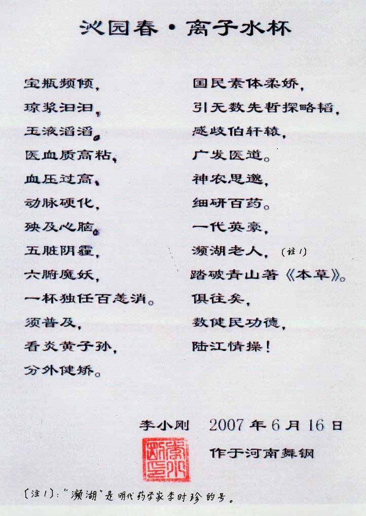 -----我是從事建筑的高工,本來沒有資格去攻克醫(yī)學難題,卻為了自身健康才扣響醫(yī)學的大門。由于我1990年患高血壓,因怕中風才研究發(fā)明了離子水瓶,我把水處理成微小分子團水,飲用后治愈了高血壓。便于1993年底送到三家省級醫(yī)院做臨床試用4個月。經(jīng)北京和廣西醫(yī)學專家鑒定:"降脂降壓效果好"," 能擴大心腦動脈流量,改善心腦電圖以及微循環(huán)","對治療心腦動脈粥樣硬化、高血壓、高血脂有良好的醫(yī)療保健作用。""產(chǎn)品的技術(shù)性能和療效達到了同類產(chǎn)品的國內(nèi)領先水平,經(jīng)廣西醫(yī)學科學情報研究所檢索,未見國外有類似報道。"中國醫(yī)學科學院張正國教授從美國國立醫(yī)學圖書館數(shù)據(jù)庫存Medline檢索英俄文資料,均未見類似報告。2000年上市后,我為了對消費者負責而繼續(xù)觀察研究,一直通過《信譽卡》和《質(zhì)量跟蹤調(diào)查書》向患者承諾療效,請用戶使用6個月后反饋效果。和脂壓患者飲用2至5個月內(nèi),消除癥狀,停服藥物,血壓正常;冠心病患者飲用3~5個月逐漸減輕至消除心絞痛、房顫等癥狀,不再服藥,飲用1年左右心電圖正常,經(jīng)冠脈造影掃描無明顯狹窄,表明冠心病痊愈。大量患者還反映許多衰弱器官被修復,讓前列腺增生、慢性咽喉炎、慢性氣管炎、支氣管炎、慢性胃炎、腸炎和膽囊炎等不藥而愈;2型糖尿病患者是因為胰島衰弱致病,飲用該水半年至一年,逐漸減藥至停藥,血糖尿糖正常,真正治愈2型糖尿病。中風后遺癥患者飲用六七個月,可逐漸減輕至消除肢體和語言障礙,表明飲用該水能讓壽命很長的神經(jīng)元細胞逐漸修復,奇跡般地恢復肢體和語言功能。飲用后還使胸腺和脾臟兩個重要的免疫器官被修復和增強,產(chǎn)生免疫細胞多,提高了免疫力,使人不生病或少生病。自此, 飲用微小分子團水創(chuàng)造了攻克冠心病、高(低)血壓和糖尿病三大醫(yī)學難題的奇跡。人們對此感到不可思議,但實踐是檢驗真理的唯一標準。